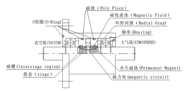 • 磁流體密封原理:磁流體密封技術就是利用磁流體對磁場的良好響應特性而實現(xiàn)的。當把磁流體注入到由高性能的磁鐵,導磁良好的極靴與旋轉軸所構成的磁回路間隙中,在磁場的作用下,磁流體在間隙中形成數個液態(tài)的“O”形圈,從而起到密封作用。